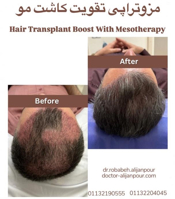 شش جلسه مزوتراپی و لیزر تقویت رشد مو به فاصله هر دو هفته انجام شد ونتیجه بسبار رضایت بخش بود.